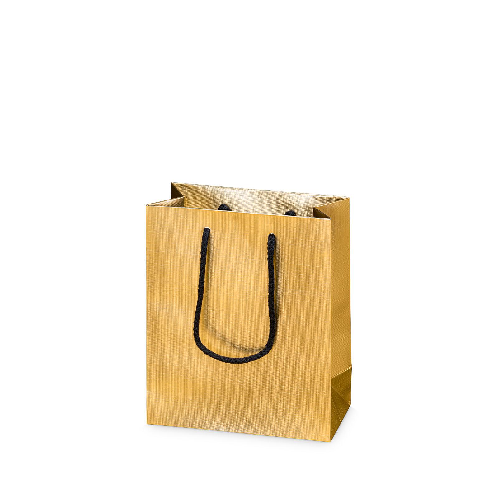 Tragetasche aus Papier mit einer goldenen Oberfläche und einer Prägung in Leinenstruktur